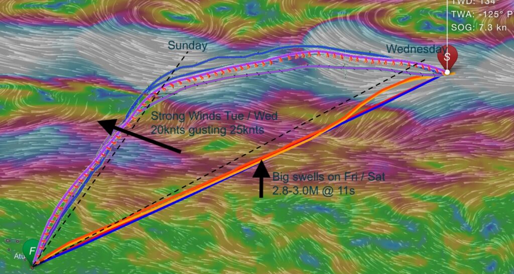 At the moment, i’m leaning towards option one and hoping the large swell isn’t too uncomfortable. That said, we’re using a weather forecasting service from “Met Bob” and i’m going to chat it through with him before making a decision.