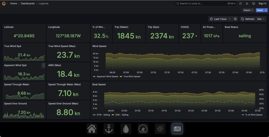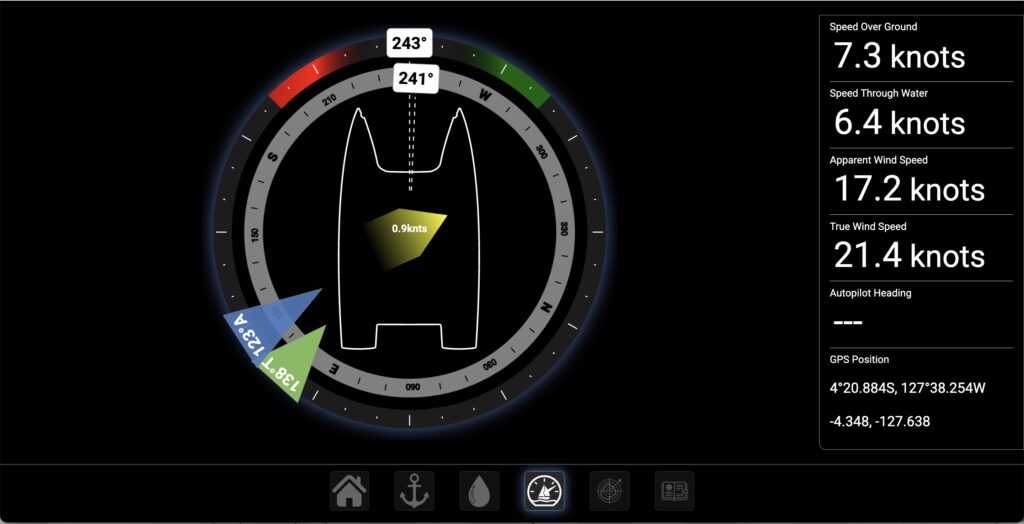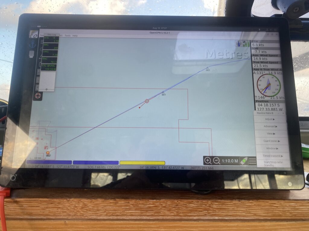 For this sort of sailing – the Autopilot is doing most of work, we’re just keeping an eye on things to ensure everything is behaving properly and to keep us on track. Most of the time the person on watch is inside watching the numbers and keeping eye on the weather and sea… I built this computer a couple of years ago for us and it works pretty well… We use an app called OpenCPN for the charts, radar and ship identification. I then wrote a bunch of apps that we use for managing the boat, watching the wind and keeping a digital logbook.