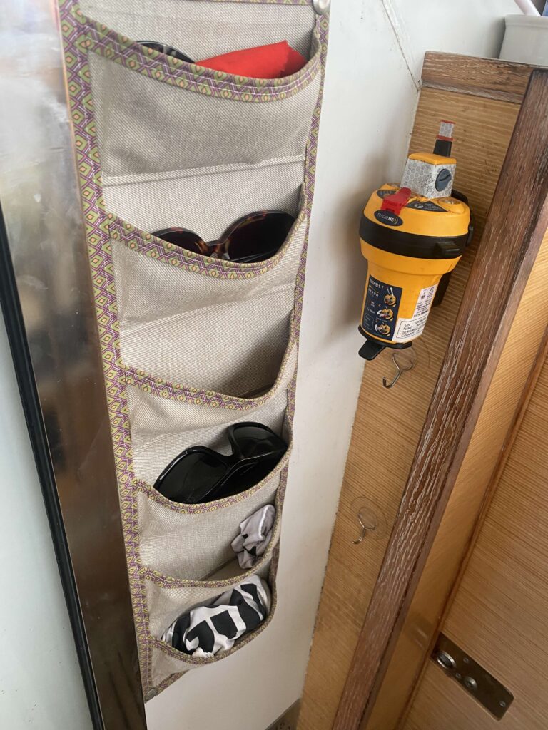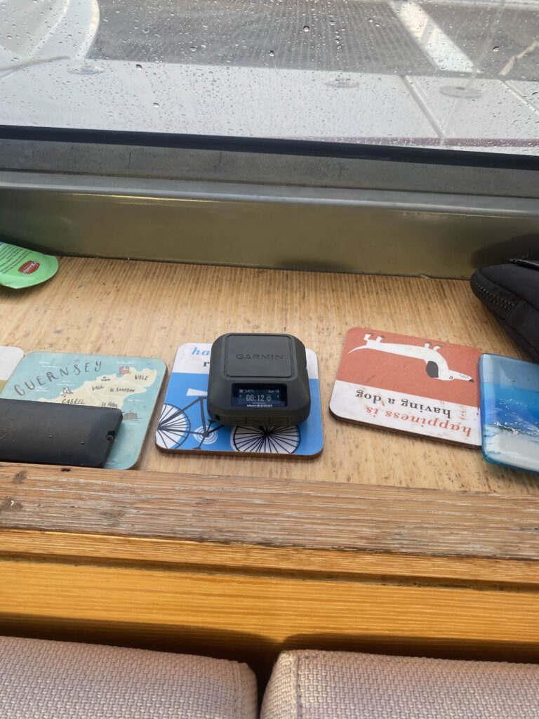 However, we also need to have a backup if Starlink were to go down (which it did for a few hours just before we left), and for that we have a Garmin Messenger. Very simple, waterproof, and with a long battery life, it’s what’s keeping our tracker up to date. It has a big “Emergency” button on the side if we ever needed to push it. You can also send and receive simple text messages. If we ever have to abandon ship, this would be one of the first things we’d grab.