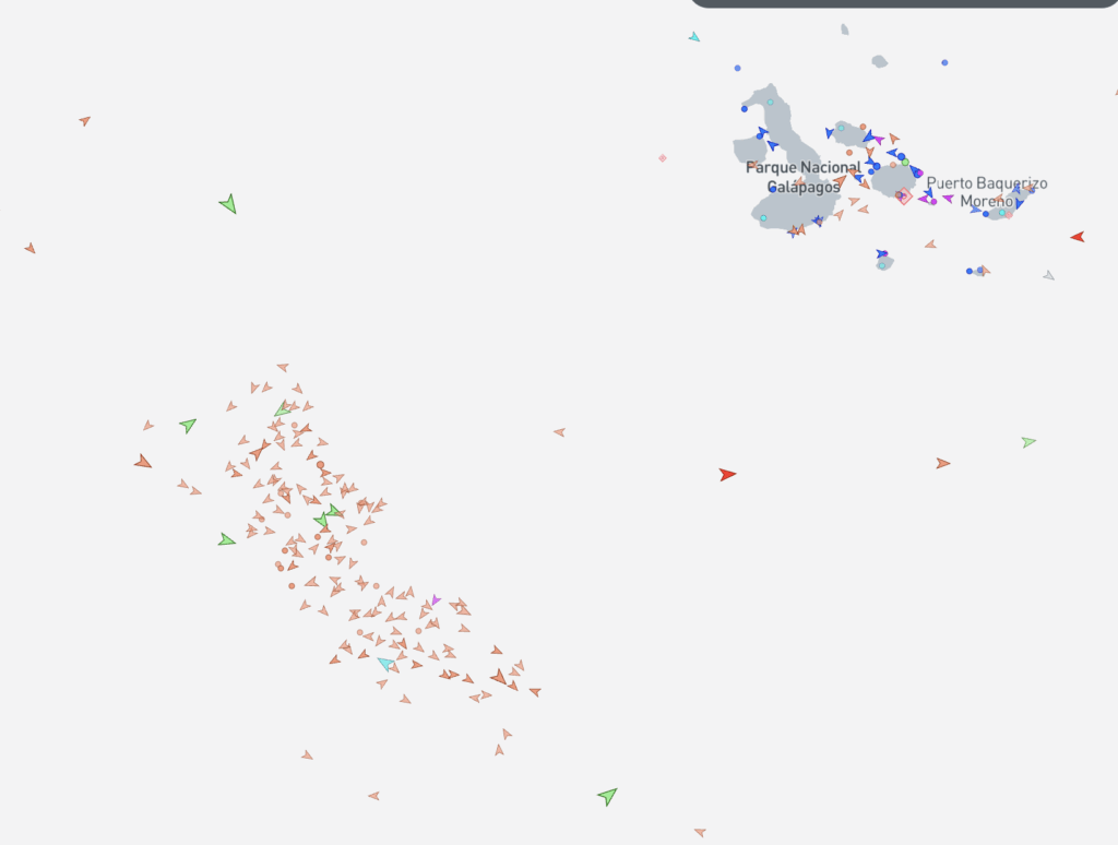 There are 100 or so boats on there in a fleet, skirting the edge of Galapagos waters, hoovering up whatever they can find – essentially raping the ocean… it’s so sad!…. Anyway, they’re trawling and long-lining, so it’s wall-to-wall fishing gear. You can’t go through the middle, so you end up going around. Based on where they are at the moment, we’ll go North.